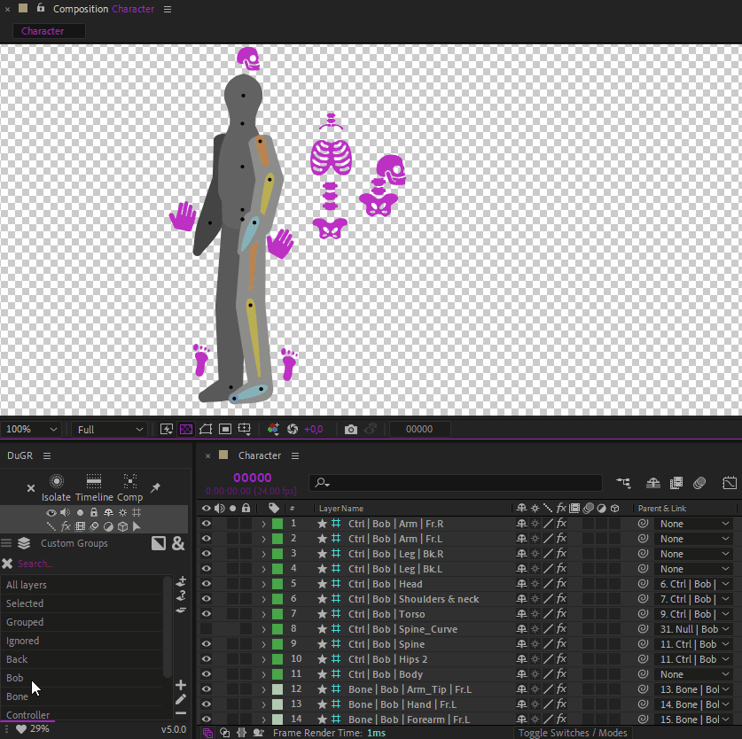DuGR is fully compatible with Duik Ángela, which automatically assigns layers to useful DuGR custom groups.